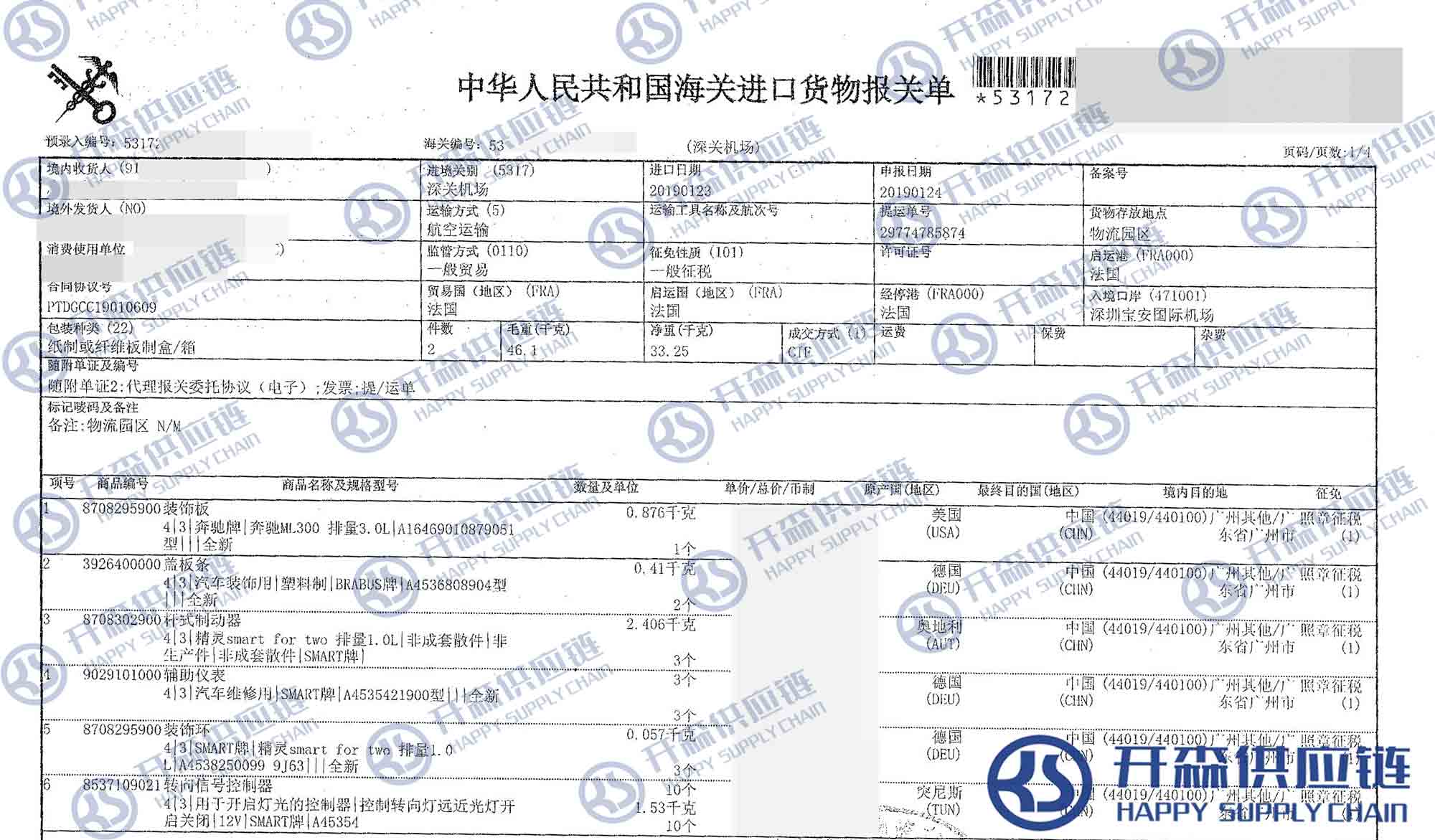 開森供應鏈擁有多種多樣的汽車配件進口渠道與豐富的進口報關(guān)案例。我司提供收貨、報檢(商檢)、報關(guān)清關(guān)、貨物運輸一條龍服務。我們公司的優(yōu)勢:1、價格優(yōu)惠;2、安全快速;3、專業(yè)與便捷。
